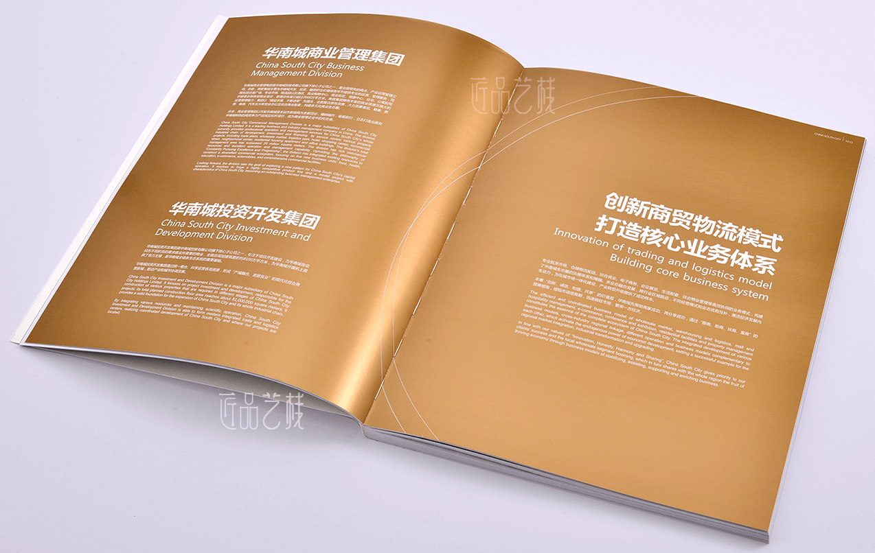 華南城控股有限公司是一家在香港聯(lián)合交易所上市的綜合商貿(mào)物流企業(yè)是中國規(guī)劃、建設(shè)、運(yùn)營大型綜合商貿(mào)物流中心的領(lǐng)航者,在此畫冊印刷,針對業(yè)務(wù)涵蓋多領(lǐng)域等生態(tài)系統(tǒng)特征,采用專金、專銀等印刷,以及特種紙、燙紅金等特色工藝搭配,準(zhǔn)確的體現(xiàn)出華南城集團(tuán)的品牌實(shí)力和宣傳特色。