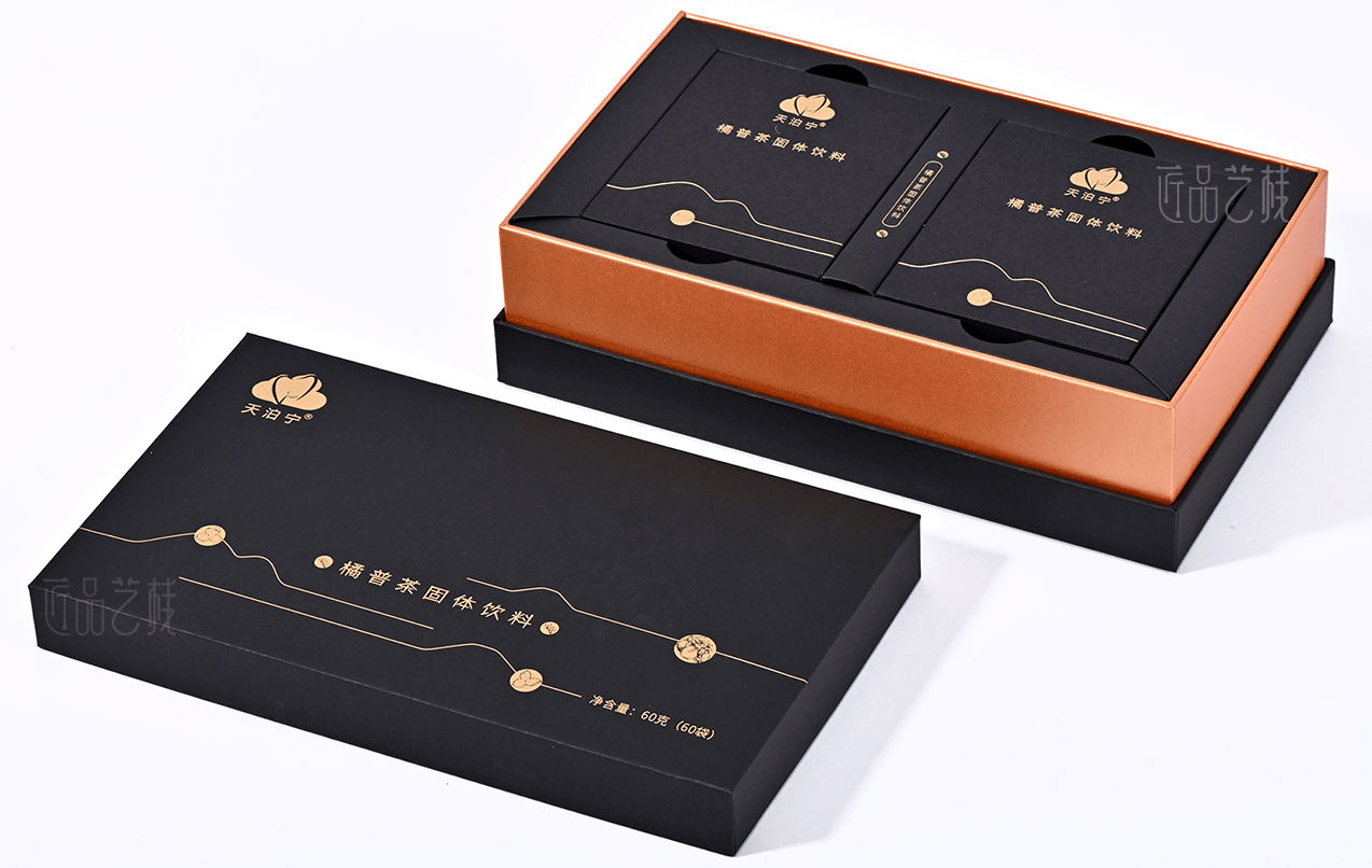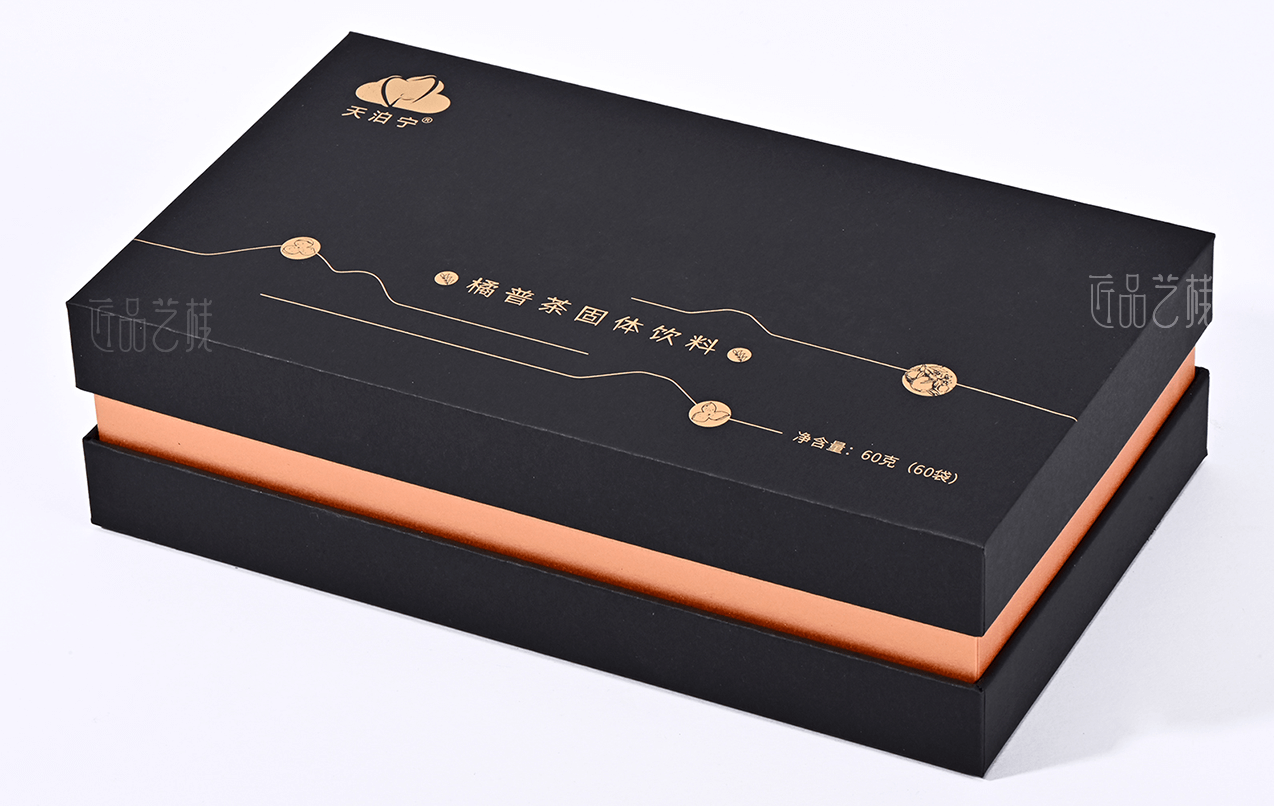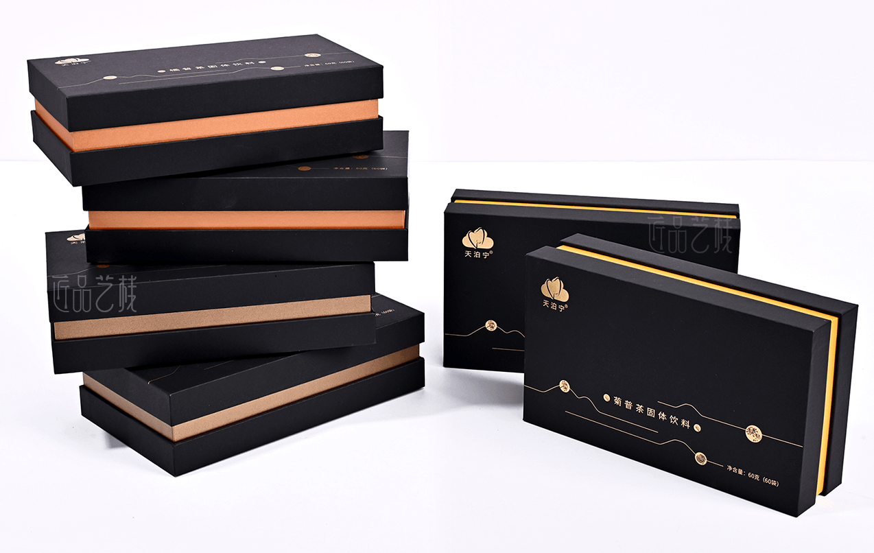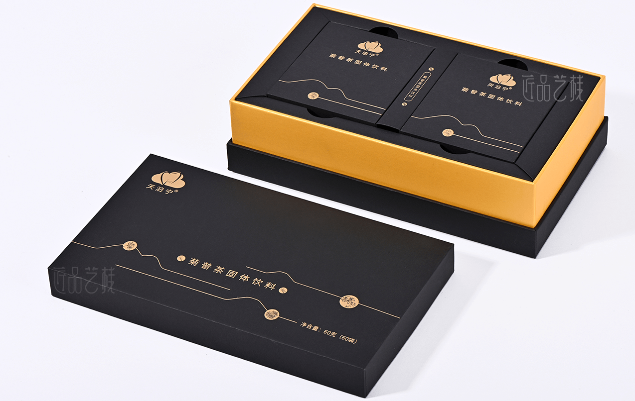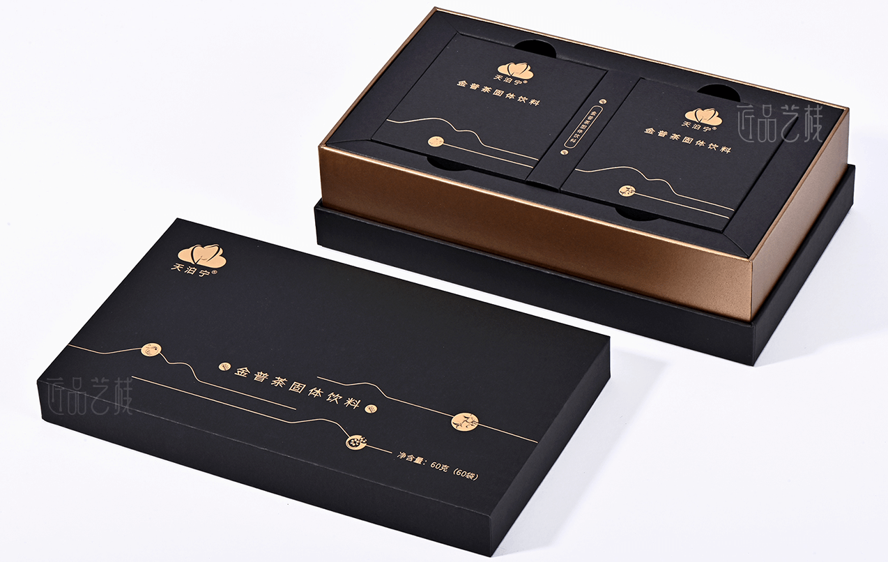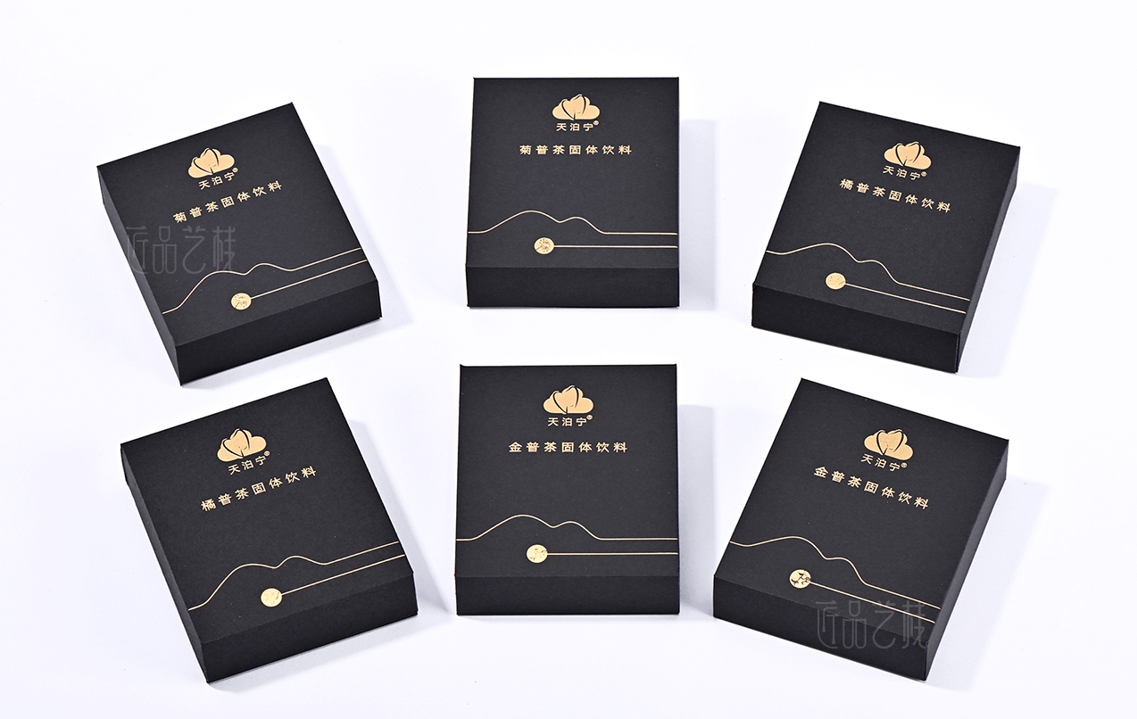 繪云生物普洱茶粉固態(tài)飲料,選用上等大葉種普洱茶,經(jīng)現(xiàn)代生物技術(shù)深度提取而成的精華茶粉。在對該品牌產(chǎn)品包裝盒定制中,佳潤隆包裝&匠品藝棧,采用黑卡紙為統(tǒng)一外包裝,并根據(jù)其菊普、橘普、金普三大產(chǎn)品系列,運用不同與產(chǎn)品相關(guān)連的特種金卡紙為圍條點輟,使繪云生物普洱茶粉包裝盒達到既統(tǒng)一品牌形象和銷售體驗,同時又形成一定的差異特點,更易于消費者識別和喜愛。