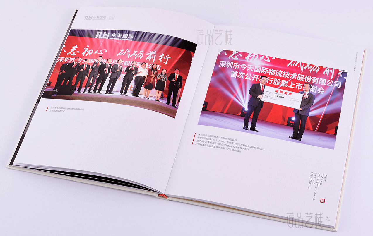 深圳今天國際物流技術(shù)公司,于2000年在深圳成立,股票代碼:300532。在今天國際上市之際,我們采用以上市流程敘述的手法,以現(xiàn)代簡約、國際范和喜慶的風(fēng)格,結(jié)合進(jìn)口紙張和精裝工藝,使整本紀(jì)念冊體現(xiàn)喜慶并不失奢華,讓人感受今天國際企業(yè)實力的同時,加以珍惜收藏。