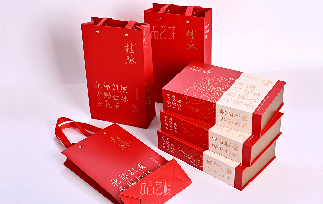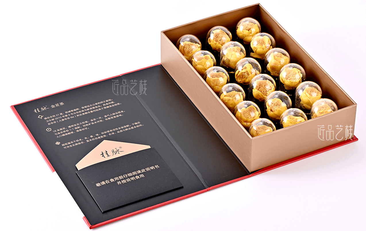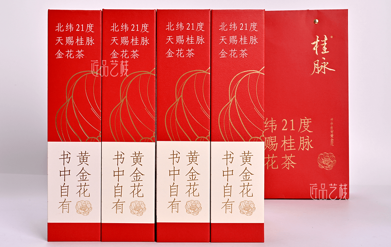 桂脈金花茶,源自北緯21度,新資源食品,部分含量遠高于保健食品標(biāo)準(zhǔn)。由佳潤隆包裝印刷&匠品藝棧提供本產(chǎn)品的包裝盒、手提袋和說明書等整套禮盒的方案設(shè)計與印刷制作,在比其原有包裝盒將近節(jié)省一半制作成本的同時,大力提高了該產(chǎn)品的溢價能力和銷售利潤。