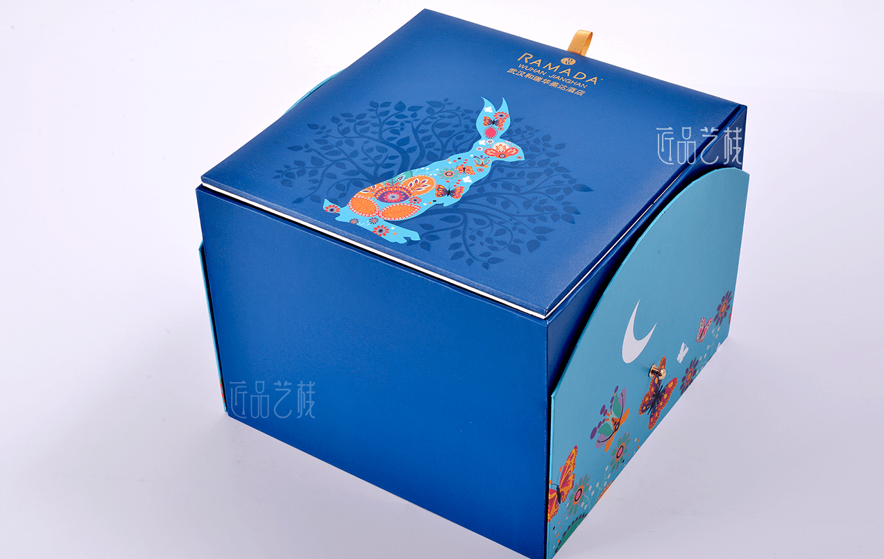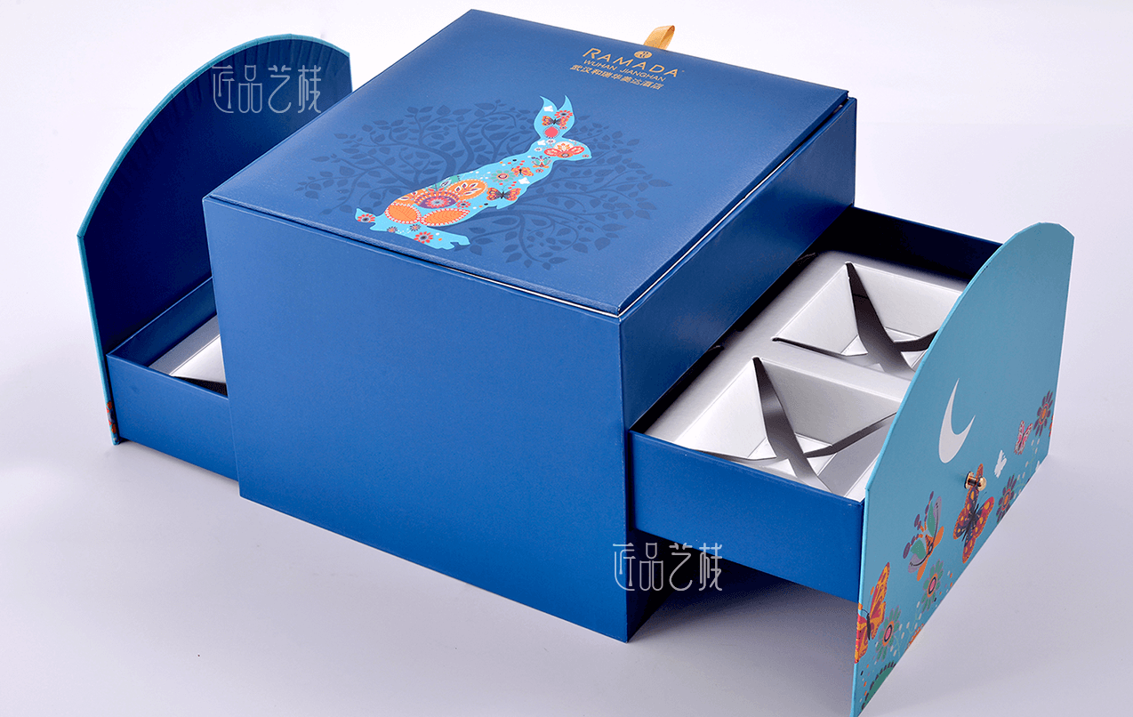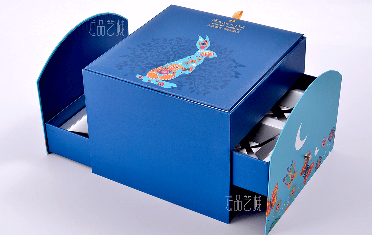 和瑞華美達(dá)酒店——昊宇集團(tuán)投資,美國溫德姆酒店管理公司授權(quán)特許經(jīng)營的華美達(dá)品牌,在其中秋月餅禮盒的印刷定制中,巧妙采用雙抽屜盒的創(chuàng)意結(jié)構(gòu)模式,以原創(chuàng)繪制元素的方式,結(jié)合特種紙張和制紋工藝,使其呈現(xiàn)出高端厚重的送禮價(jià)值和品牌氣質(zhì)。