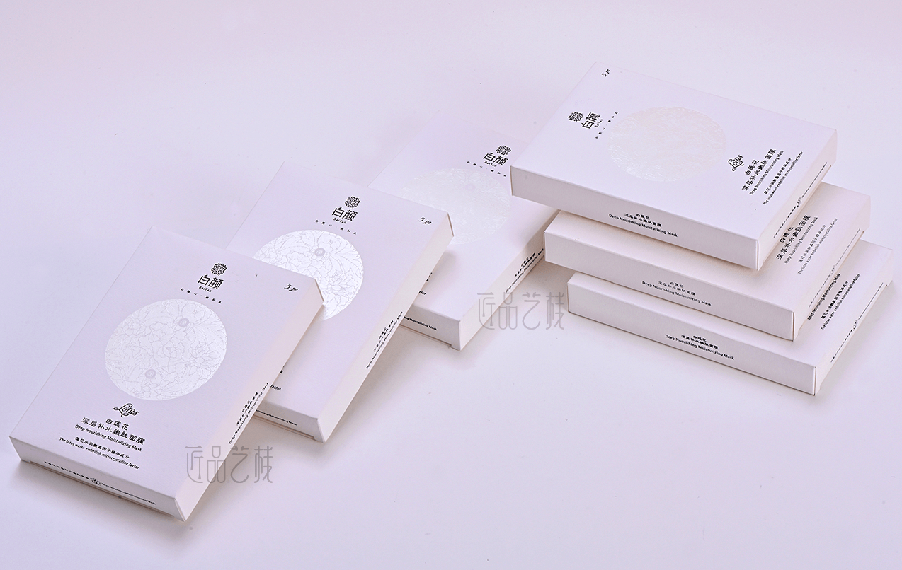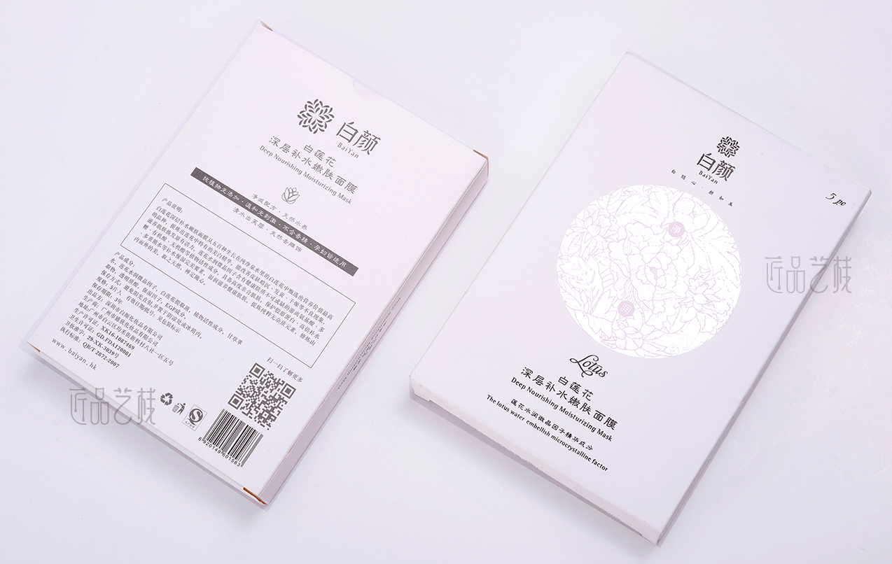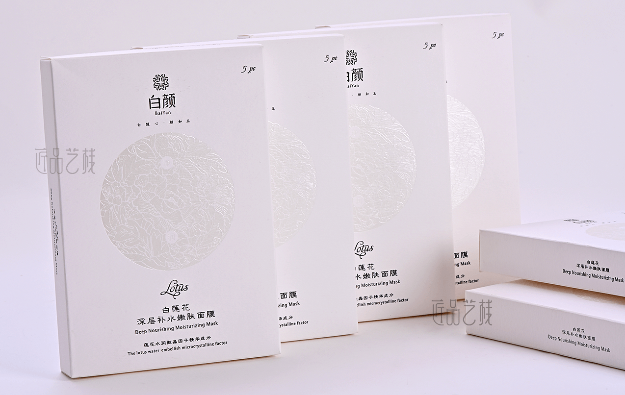 白顏品牌面膜,深圳白顏化妝品有限公司旗下自主經(jīng)營(yíng)品牌系列,白蓮花深層補(bǔ)水嫩膚面膜,佳潤(rùn)隆包裝印刷&匠品藝棧在與在白顏面膜品牌包裝盒定制中,采用特種白卡紙張,海德堡設(shè)備精印,白色與黑色金燙印等工藝,并配置a級(jí)瓦楞紙內(nèi)托,大力提升白顏面膜品牌簡(jiǎn)而不凡的品牌氣質(zhì)和市場(chǎng)認(rèn)可度。