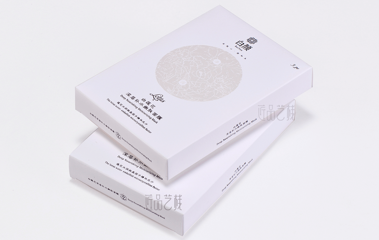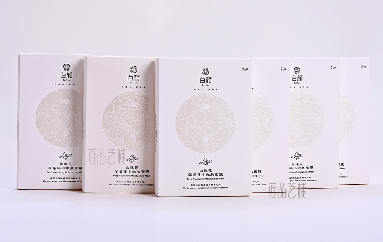 深圳白顏化妝品有限公司,旗下自主經(jīng)營(yíng)白顏品牌系列白蓮花深層補(bǔ)水嫩膚面膜,在其產(chǎn)品包裝盒定制合作中,佳潤(rùn)隆包裝印刷&匠品藝棧采用特種白卡紙張,海德堡彩色機(jī)印刷,白色與黑色金燙印,并配置a級(jí)瓦楞紙內(nèi)托,使該面膜包裝盒呈現(xiàn)出簡(jiǎn)而不凡的品牌氣質(zhì)。