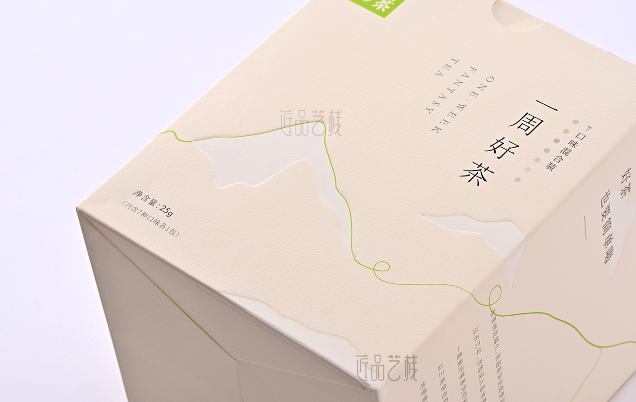 一周好茶,是奈雪的茶特別選擇了深受年輕消費者喜愛的花茶品類,以杯杯專屬新意不重樣的理念,帶來更加專注且豐富的產品升級,在其產品包裝紙盒的訂做上,亦采用簡約新潮的創(chuàng)新紙張,配合簡約的印刷色彩、燙金和凸印工藝,使其呈現(xiàn)出現(xiàn)代簡約、深受年輕消費者喜愛的包裝風格。